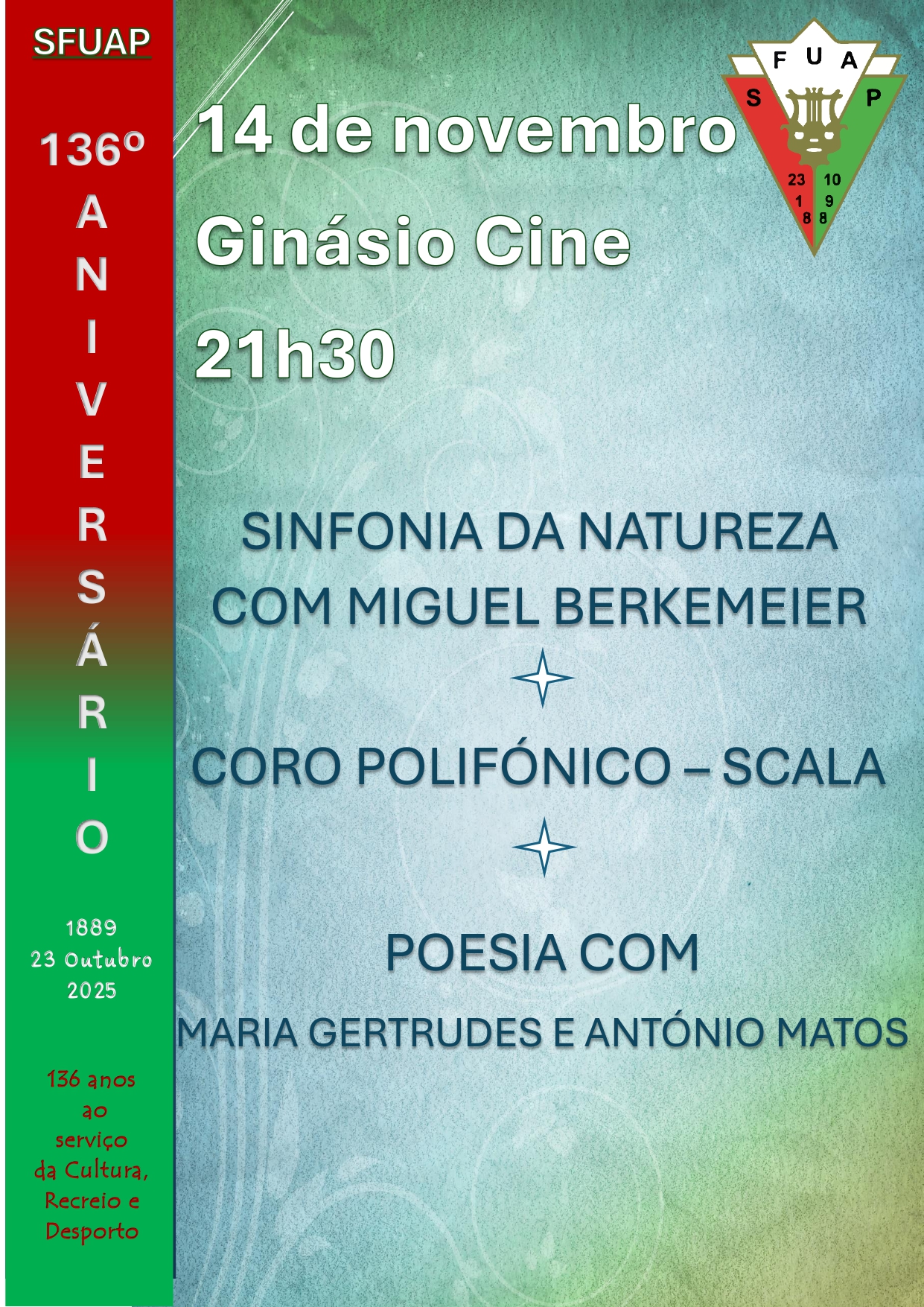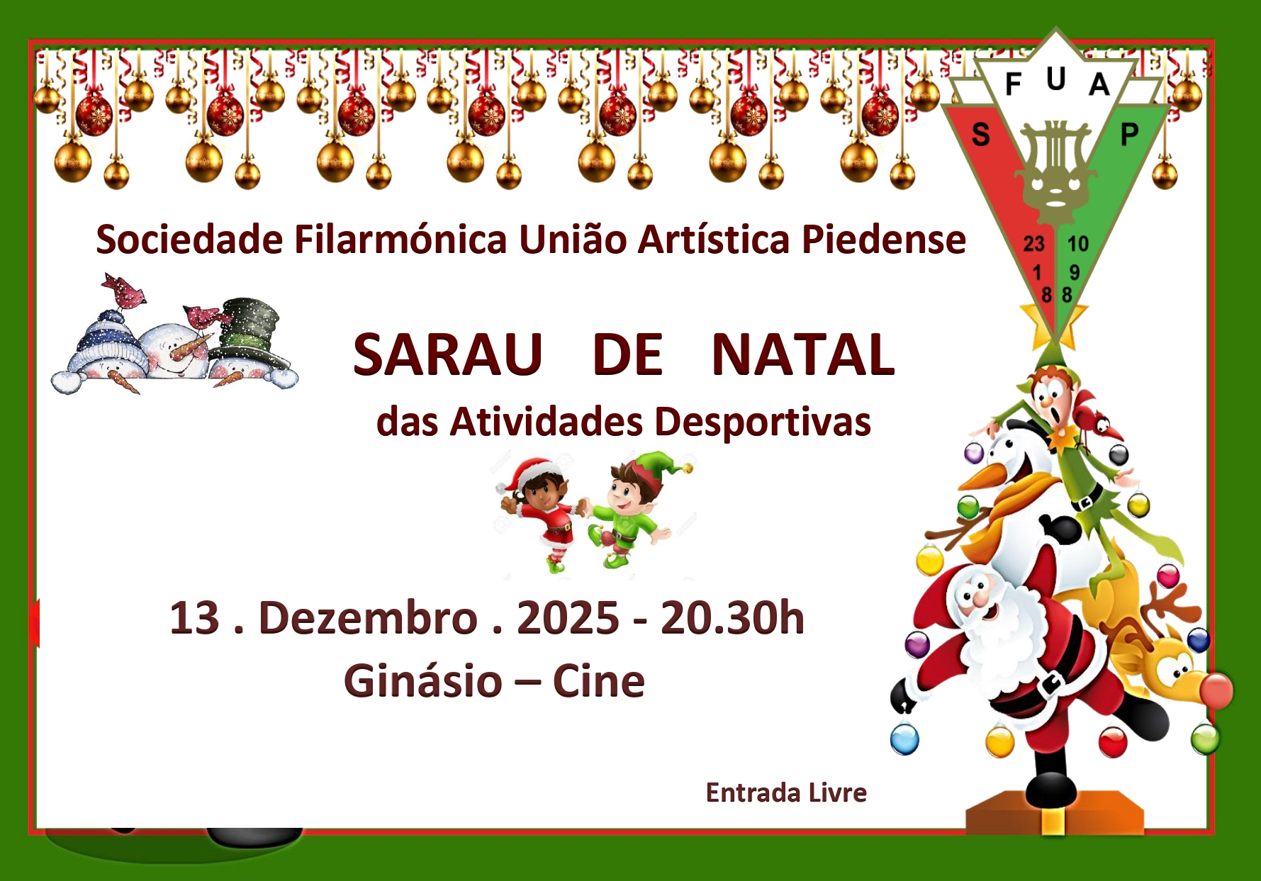 Venha assistir ao Sarau de Natal da SFUAP, no dia 13 de dezembro de 2025, no Ginásio-Cine, Cova da Piedade, Almada, pelas 20h30.